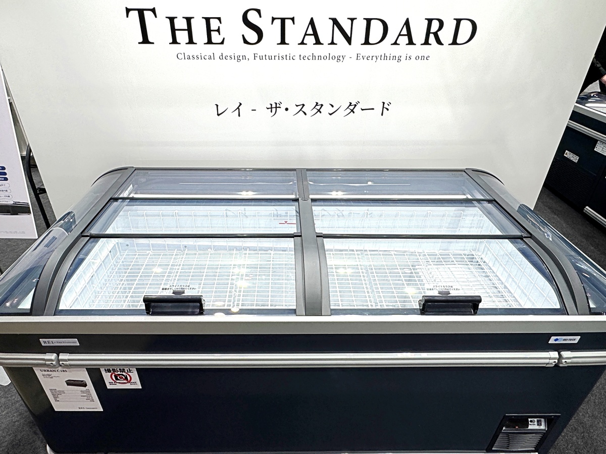 レイテックは業界屈指の省エネ性能を誇るプラグインショーケース「REI – THE STANDARD(レイザ・スタンダード)」シリーズを展示。最新型インバーターコンプレッサーを搭載しており、最適な運転をコントロールする。