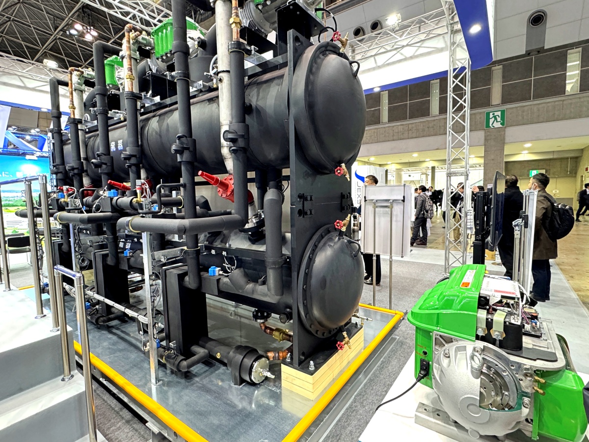 日本熱源システムはビルや工場空調、データセンターの冷却に最適な「ターボ冷凍機 スーパーブルー」を展示。磁気軸受け採用で摩擦ゼロ、オイルレス構造により高効率運転が可能なターボ冷凍機となっており、心臓部にはDanfoss社製のTurbocorを搭載している。