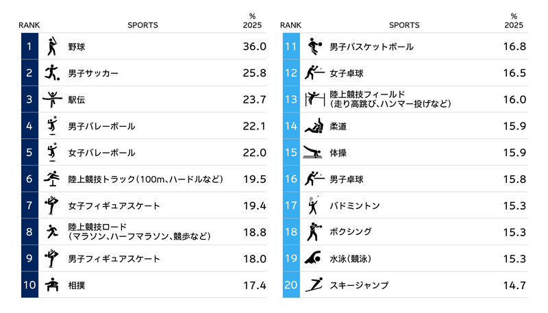 調査結果によると、競技への興味関心では野球が36.0%でトップとなり、男子サッカー25.8%、駅伝23.7%、男子バレーボール22.1%、女子バレーボール22.0%が続いた。情報を見聞きする選手では、大谷翔平、山本由伸、佐々木朗希が上位を占め、現役メジャーリーガーの存在が野球人気をけん引している構図が浮かんだ。