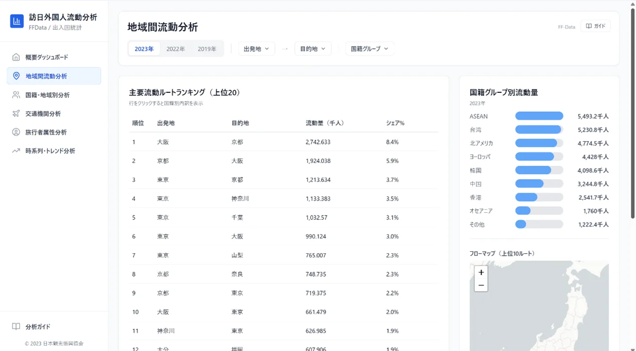 対応データは、FF-Dataが2022年と2023年の年次データ、出入国管理統計が2024年と2025年のデータで、いずれも2019年データを比較用に収録している。これにより、足元の訪日動向だけでなく、コロナ禍前との比較も可能になる。都道府県別の来訪者数や国籍別シェアを一覧できるほか、出発地と目的地の関係をフローマップで示す地域間流動分析にも対応し、訪日客の流れを直感的に把握できるとしている。