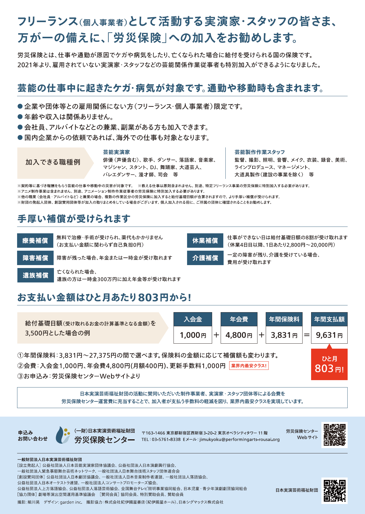 その第一歩として、財団は「労災保険センター」を設置し、2025年10月から労災保険特別加入の業務をスタートさせた。これまでは協同会員となる団体を通じた加入手続きが先行していたが、12月15日からは所属団体の有無を問わず、個人事業者として活動する実演家やスタッフ、制作者などが個人で申し込めるようになった。財団の会員でなくても加入手続きができる。