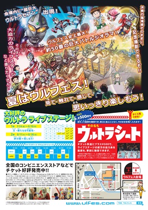 メインイベントは、毎年行なっているウルトラライブステージ。1部では「X~新たなる可能性~」、2部では「絆の鎧×信じる力」と題し、会期を分けて実施する。「ウルトラシート」が用意され、事前に予約することでライブステージを前方で観覧できるのも魅力となっている。その他、会場では、巨大なウルトラセブンやゴモラの出現、約50畳の巨大なバトルジオラマを展示する。