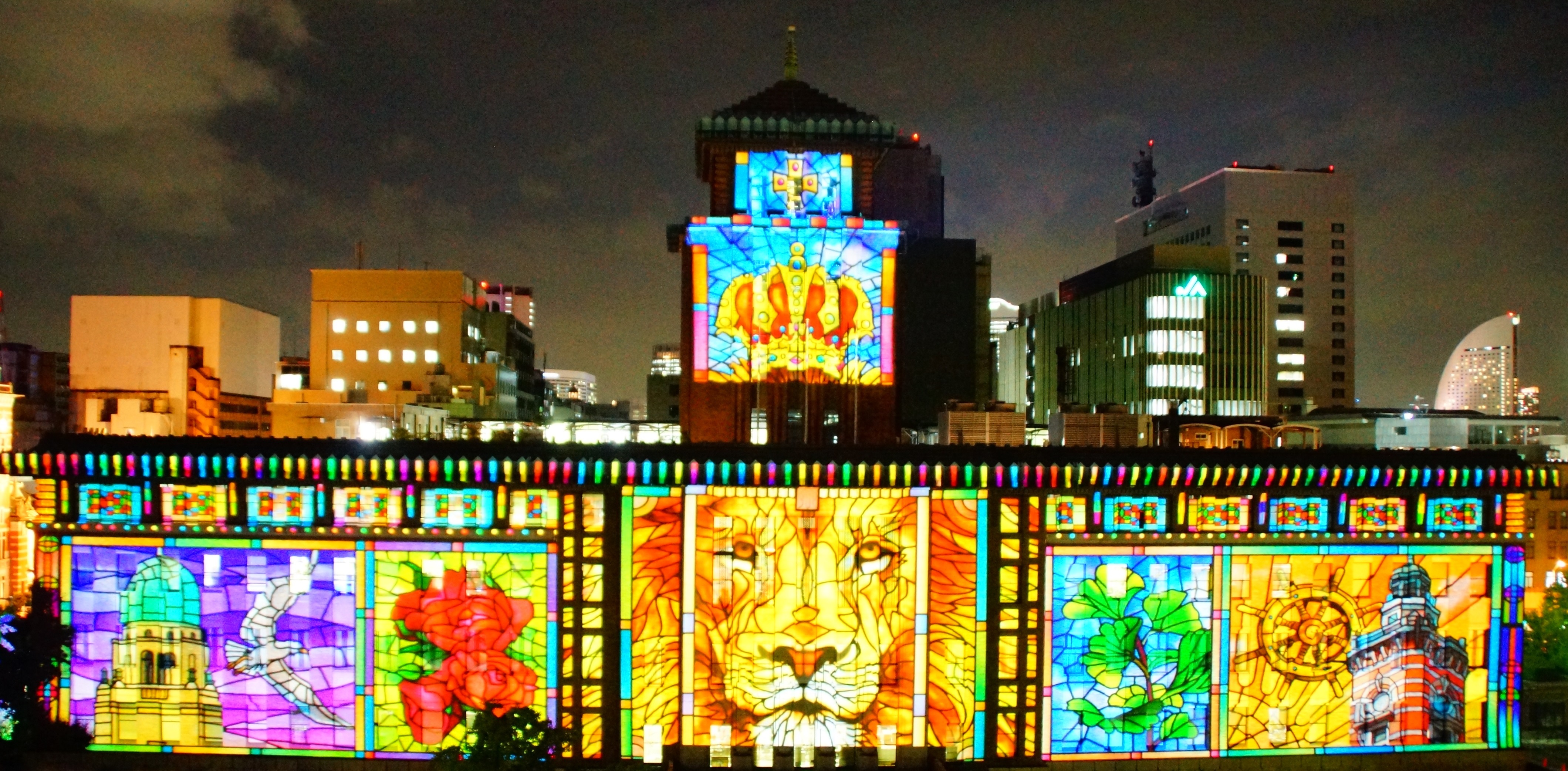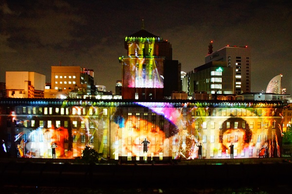 これは、神奈川県の地域活性化を図るプロジェクトの一環で、本建屋の幅79m・高さ22.6mと、屋上塔も含めた巨大なスクリーンにプロジェクションマッピングを行なう。プロジェクターは2万ルーメンを12台使用で、投影距離は約63m。