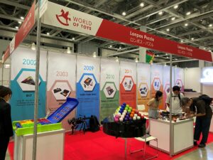 LONPOS Braintelligent Co., Ltd. creates brain-bending puzzle games for all ages. These puzzles challenge players to complete patterns in 2D and 3D space using oddly shaped pieces. At the Tokyo Toy Show, visitors are able to playtest several of these games, the most popular of which is the “LONPOS Clever Creator.” To solve Clever Creator puzzles, various building blocks consisting of arrangements of spheres must be positioned in order to correctly complete a 2D plane or to construct a 6-layer pyramid corresponding to a selected puzzle. The game contains a total of 303 puzzles at varying difficulty levels, and the “normal” puzzles are already fairly challenging. LONPOS is based in Taiwan, and the manufacturer is looking forward to capitalizing on their first Toy Show appearance in order to connect with Japanese buyers.