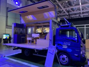 Mobility is not only a factor in cities, however. It influences the way we interact with nature as well. Mitsubishi Fuso is using the Japan Mobility Show as an opportunity to promote their NOMADPro camper. What sets the NOMADPro apart from the other RVs at the show is the fact that the right wall of the truck can unlatch like a gull-wing door, opening up the living space to the outdoors. This feature allows the usually small space of a camper to become incredibly more spacious, and it also doubles the available floor area. The NOMADPro contains all the necessary amenities for a comfortable camping trip, including a folding bed, an induction stove, a private shower room, and even a mounted TV screen. The camper is perfect for those who want to bring more nature into their everyday lives.